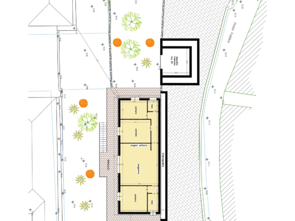 Vorgesehen ist ein ca. 100 qm grosses Haus, dessen Rückseite an die Mauer des terrassierten Grundstücks gebaut wird, das bedeutet, es verfügt über Fenster nach vorne (Richtung Süden) und zu den Seiten.
