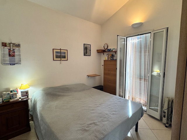 The apartment is located on the first floor of a two-storey, residential building detached on three sides and offers approx. 37 m² of net living space. From the street, a staircase leads to the entrance gate. The apartment is composed of a central living space with an open kitchen area and two window-doors that lead to the approx. 8 m² terrace, in a sunny west-exposure. From this room you can access also the bathroom with shower, as well as the bedroom, which has a small terrace facing south on its own.