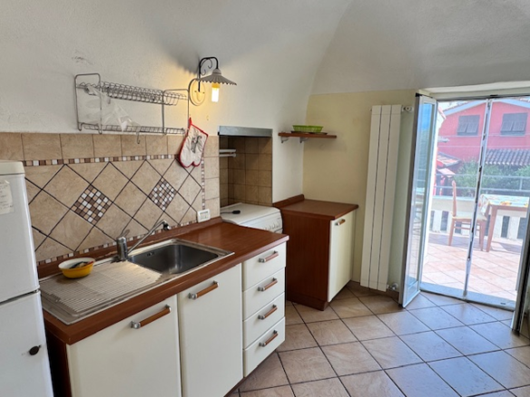 L‘immobile si trova al piano e terra e al primo piano di questa casa suddivisa in tre parti. Al piano di sopra troviamo l‘ingresso che porta al salotto, caratterizzato dai soffitti a volta in pietra. Dopo un paio di gradini, si giunge alla cucina attrezzata, dalla quale si ha un accesso diretto alla grande terrazza soleggiata. La camera da letto con soffitti a volta dona abbondante spazio per un letto matrimoniale e un grande armadio. Troviamo ancora il bagno con finestra e due ripostigli. Al piano di sotto troviamo invece due cantine collegate, con ingressi separati, che attualmente vengono utilizzate come stanza lavanderia e magazzino.