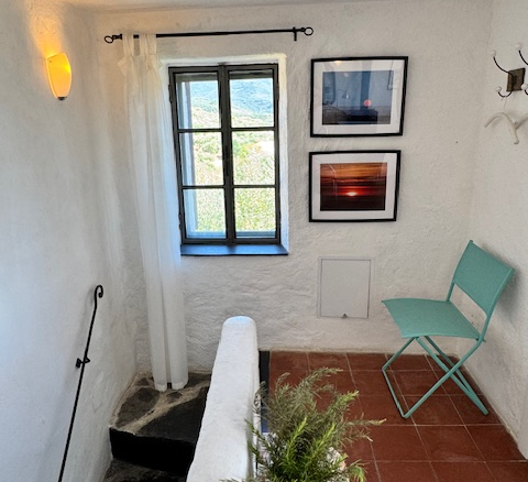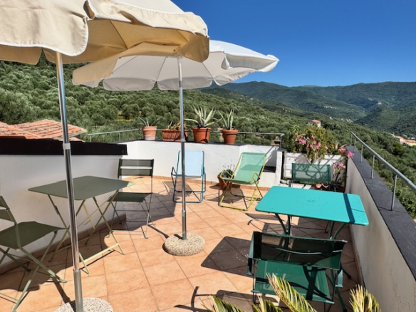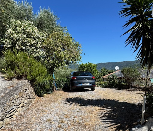 The roof terrace, which is approx. 20 m², offers space for sun loungers, a table, and chairs. Here, you can enjoy a fantastic 360° view of the mountains behind you, the evergreen olive groves, and the sea beyond. On clear days, you can even see Corsica, and at night, the lights of Imperia-Porto Maurizio twinkle on the coast below. The separate flat has a small, idyllic 13 m² terrace with seating and views of the greenery. The gravel car park, which is approx. 54 m² in size, is located directly in front of the house and offers space for one large or two small cars, as well as a small wood shed for storing firewood.