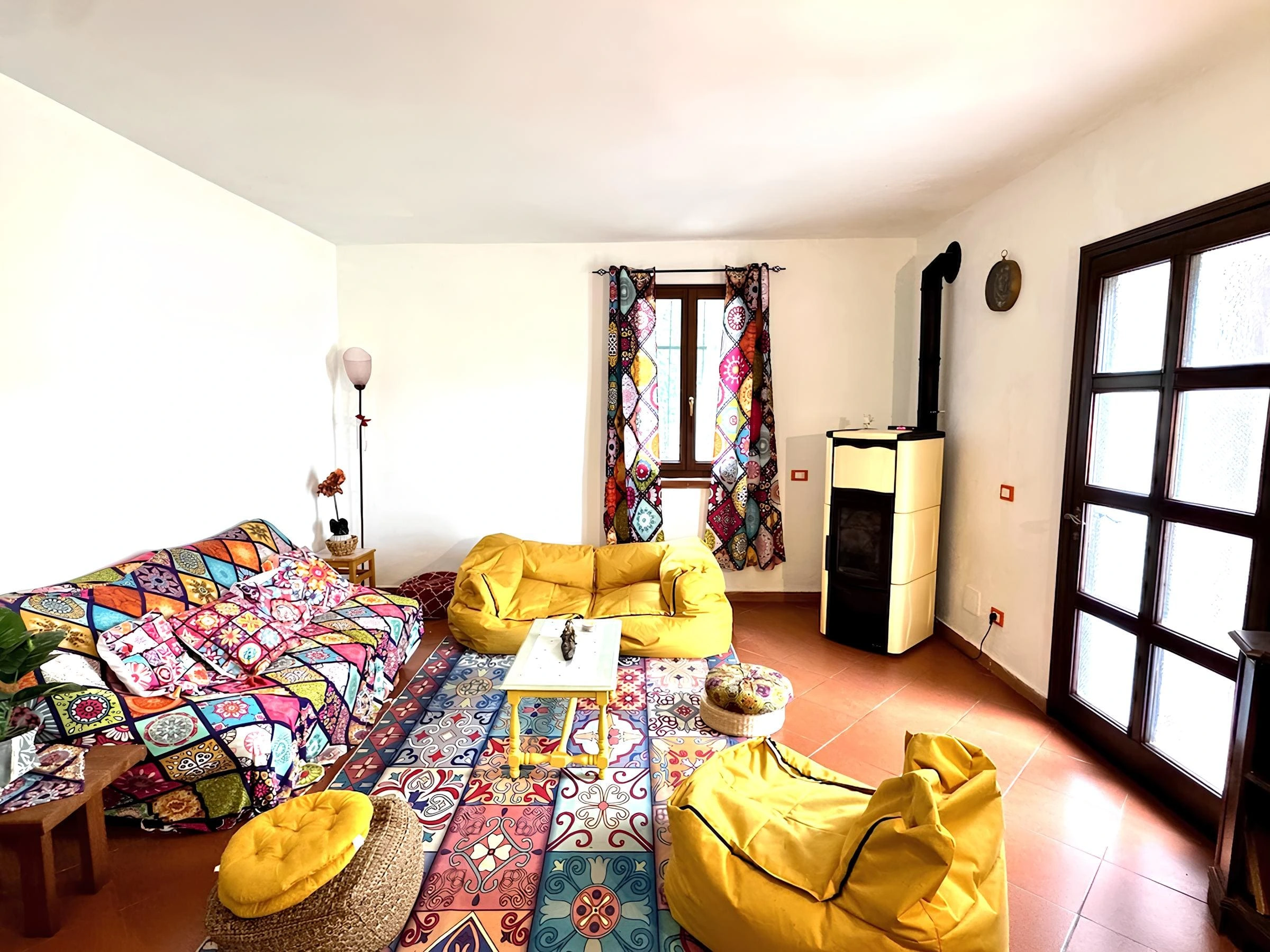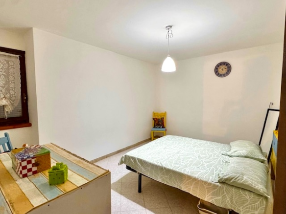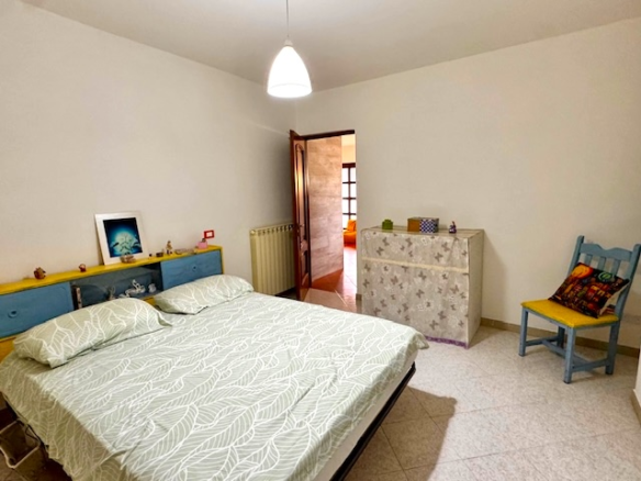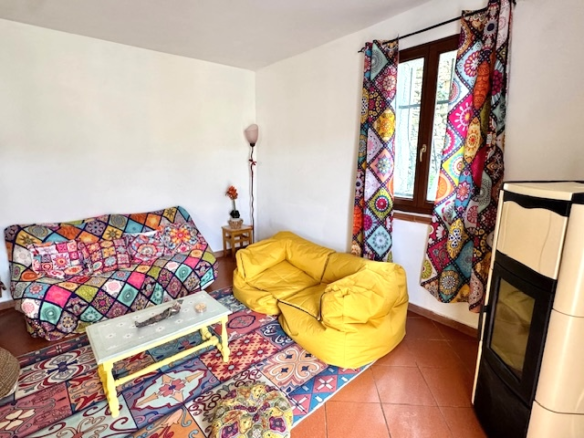 The flat is located on the ground floor of a three-storey natural stone house. The front door leads directly into a spacious living area with kitchenette and dining area. From here, you can also access the second terrace. Behind this are three bedrooms and two adjoining bathrooms. If you only need two bedrooms, the living room could be enlarged relatively easily by knocking through a wall.