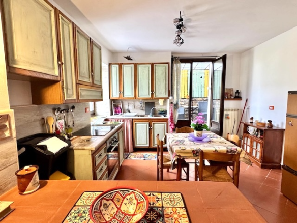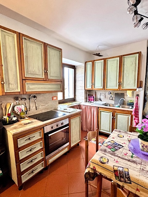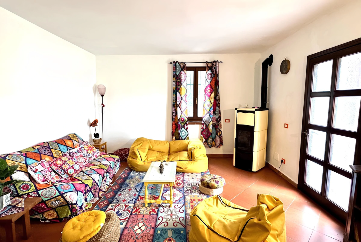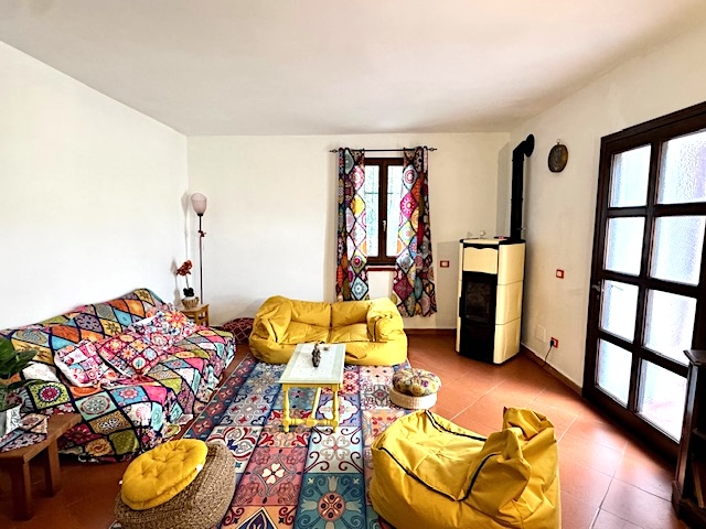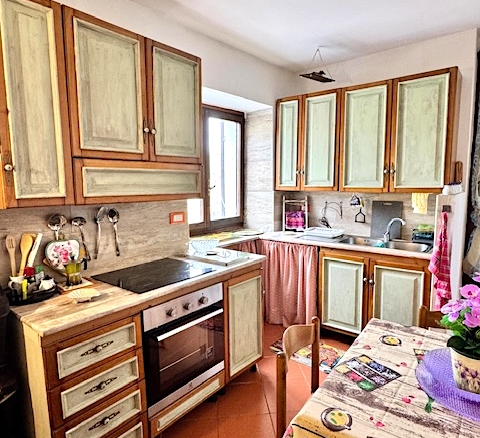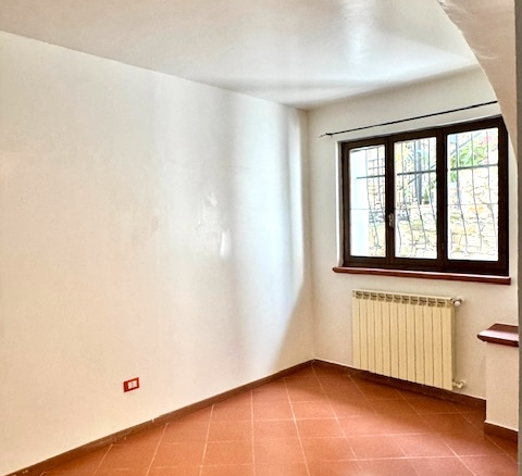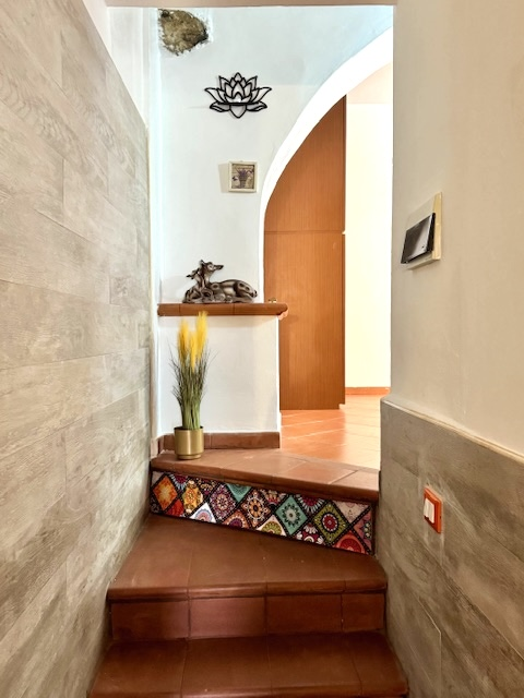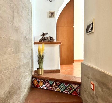 This flat is located in a natural stone house on the edge of Costa Carnara and impresses with its unobstructed view of the valley and its convenience: you can drive right up to the house and find public parking spaces and the bus stop right outside the door. You enter the flat via a small staircase and the approx. 20 m² long terrace, which offers enough space for dining or parking bicycles. There is also another terrace in front of the kitchen.