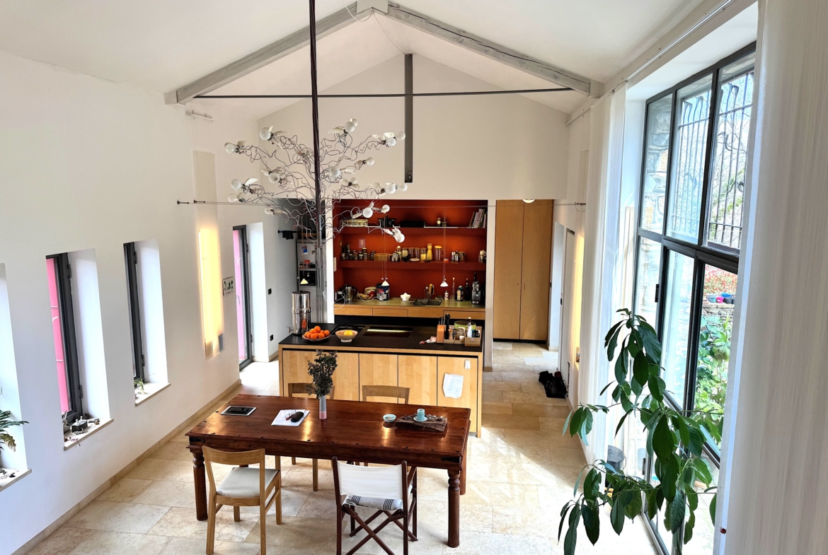 La casa principale, costruita in pietra locale, si sviluppa su due livelli, entrambi con accesso diretto al giardino grazie alla posizione collinare. Al piano superiore si trova un ampio ambiente in stile loft di circa 70 m², disposto su due livelli. Comprende una cucina su misura di alta qualità con isola, una zona pranzo con stufa a legna e angolo lettura e, pochi gradini più in alto, un grande spazio attualmente adibito a camera da letto e studio. L’ambiente colpisce per l’altezza del soffitto, la luminosità e le porte-finestre a tutta altezza che si aprono sulla terrazza antistante. Completano il piano un bagno per gli ospiti e un ripostiglio. Il piano inferiore ospita due camere da letto, entrambe con accesso alla terrazza, e un ampio bagno con vasca da bagno freestanding. Su questo livello si trova anche un grande locale di circa 45 m² di superficie utile con ingresso indipendente, ideale come cantina, atelier, studio o sala fitness. La dependance indipendente, con una superficie netta di circa 46 m², dispone di un angolo cottura, una zona pranzo e soggiorno, e una camera da letto con bagno en-suite separato da un pannello. Ha due uscite sul giardino ed è situata a pochi passi dalla casa principale, risultando ideale per ospiti o per essere affittata.
