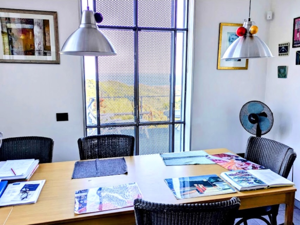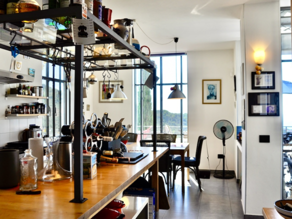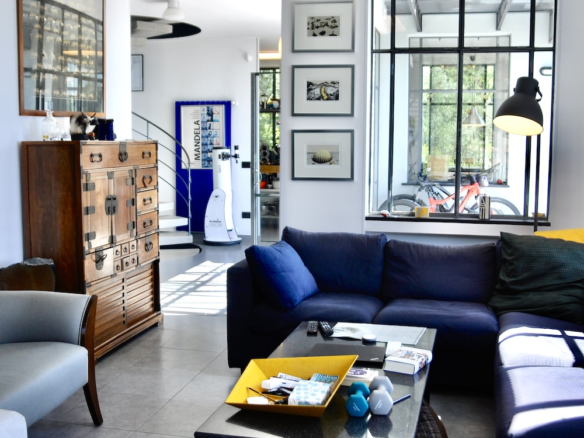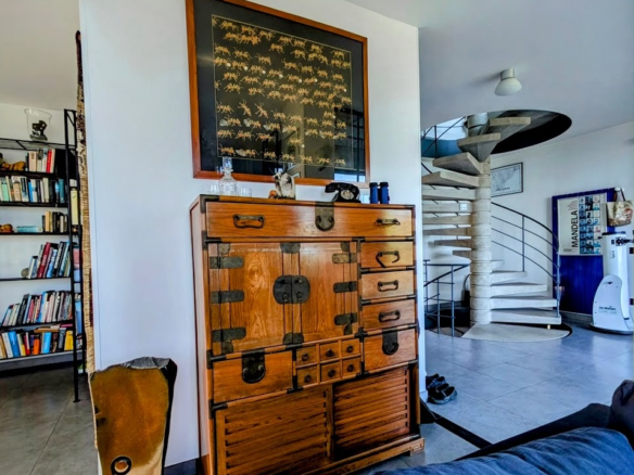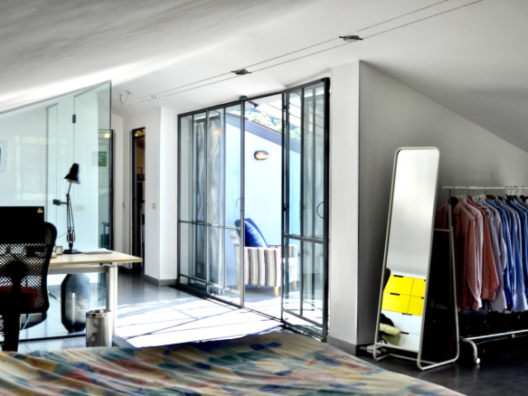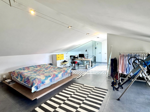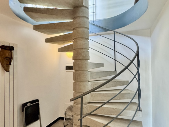 At the heart of the villa, a sculptural freestanding concrete spiral staircase rises like an art installation, a striking centrepiece that unites the home’s three levels. The ground floor features a light-filled open-plan living space with about 80sqm net, with kitchen and dining area, and a spacious living room with fireplace, plus a guest bathroom and a separate utility room with its own entrance. Every element has been thoughtfully designed for both comfort and security: Ligurian-inspired metal designer shutters shield the interiors from the summer sun while ensuring privacy and safety. From here, step onto the partially covered 58 sqm terrace offering an expansive area for entertainment and enjoyment. On the upper floor, glass walls open to the master suite with a gym and bathroom. A private, sun-soaked terrace with a glass roof offers a tranquil escape. The lower level houses the remaining bedrooms with sea views and two bathrooms. It opens directly to a gravel garden with cacti and perennials on its own terrace. Lastly, a generous storage cum workshop completes this level.