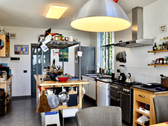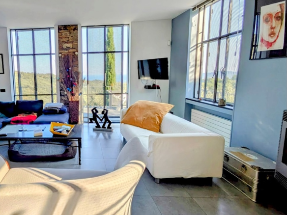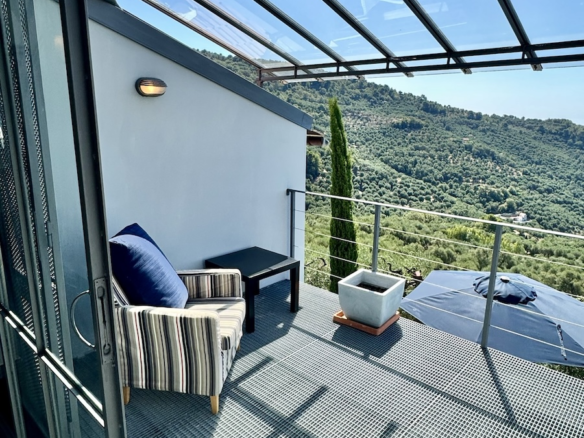 Perched above the coastal town of Diano Marina, this exceptional villa blends seamlessly into centuries-old, south-facing olive terraces with their timeless dry-stone walls. The home’s modern-minimalist architecture—with bold industrial touches, an expansive handcrafted terrace, and floor-to-ceiling glass—opens every room to breathtaking views of the unspoilt Ligurian hills rolling down to the sea. This is not just a home—it’s an energy-independent retreat. A solar system with storage battery generates more than the electricity you need for air conditioning, heating, hot water, and a heat pump. A solar thermal system complements the setup, while wood from the property’s own olive terraces fuels the Max Blank designer stove in winter.