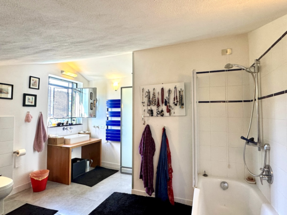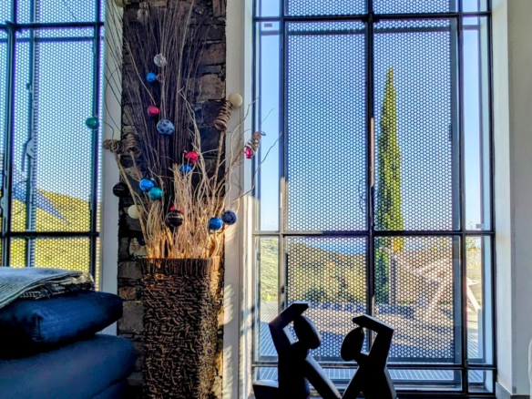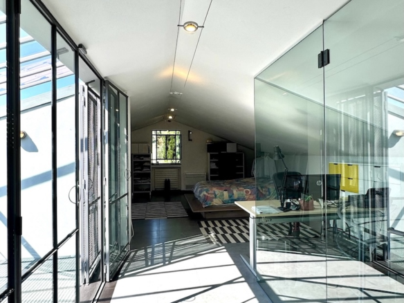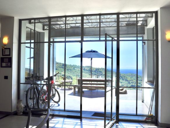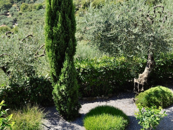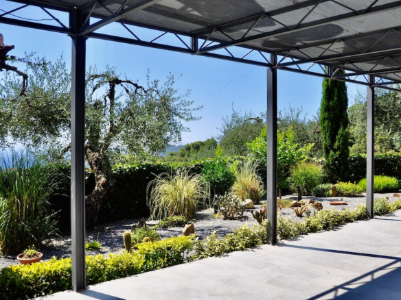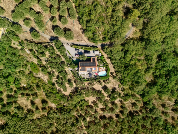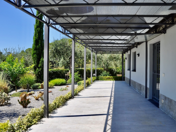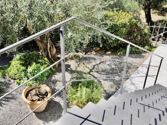 The 4,500 sqm private estate is a lush Mediterranean paradise—cypresses, oleanders, lavender, herbs, and tall grasses blend effortlessly with architectural landscaping. A steel staircase matching the overall iron concept leads to approximately 90 olive trees, yielding your own organic olive oil. Nestled among the property’s oak trees, a dedicated, shaded area provides an exercise space for dogs, harmoniously integrated into the landscape. There is an automatic irrigation system including a large water tank for the house perimeter and the olive terraces in place. There is a possibility to purchase a further 2,300 sqm of olive grove or forest for potential expansion.