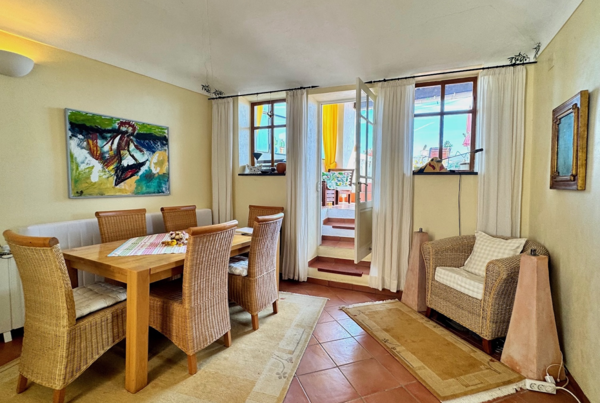 Questa casa si trova alla periferia di Valloria, un paesino definibile un museo all’aperto grazie alle sue porte dipinte da svariati artisti. Vi si trovano anche pittoreschi vicoli, molta tranquillità e un’ampia vista sugli uliveti sempreverdi fino al mare. La zona giorno si trova comodamente su un unico livello, con molte finestre e soffitti alti che conferiscono alle camere un’atmosfera accogliente. L’highlight è la spaziosa terrazza adiacente al soggiorno, coperta a metà, la quale offre anche uno spazio all’ombra e protetto dal vento. La casa ha diverse cantine, una direttamente adiacente all’appartamento, altre con i propri ingressi – tutti con porte dipinte.