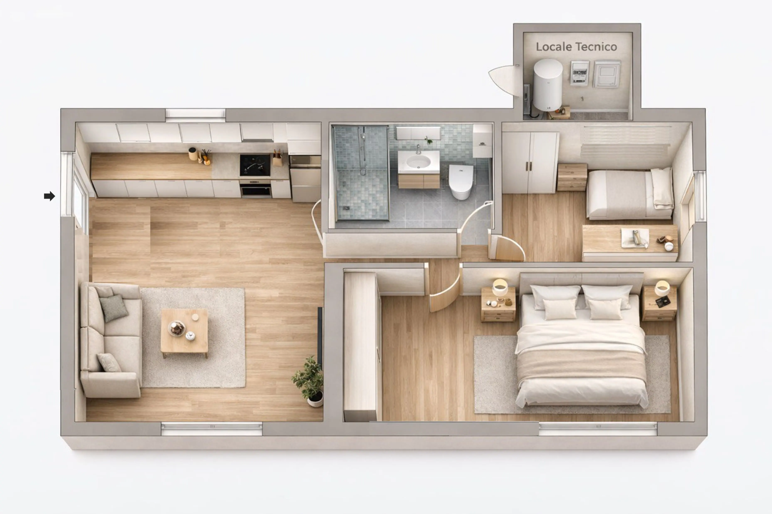 All rooms in the house are on one level: The front door leads directly into the bright, approx. 30 m² living area with open-plan kitchen and large French windows. In addition to a hallway and a bathroom with shower, there is a 15 m² bedroom and a small 7 m² studio.