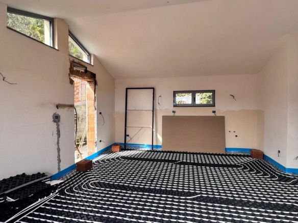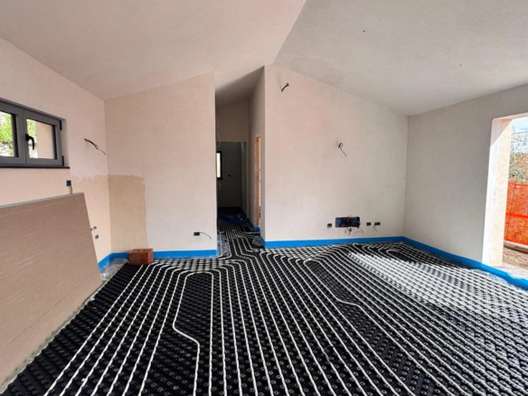Completely finished with insulated glass windows, aluminium shutters, bathroom finished, connections for the kitchen, tiled floors with underfloor heating, split systems for heating and air conditioning, connections and pipes for solar panels. Buffer for heating/hot water in the utility room.