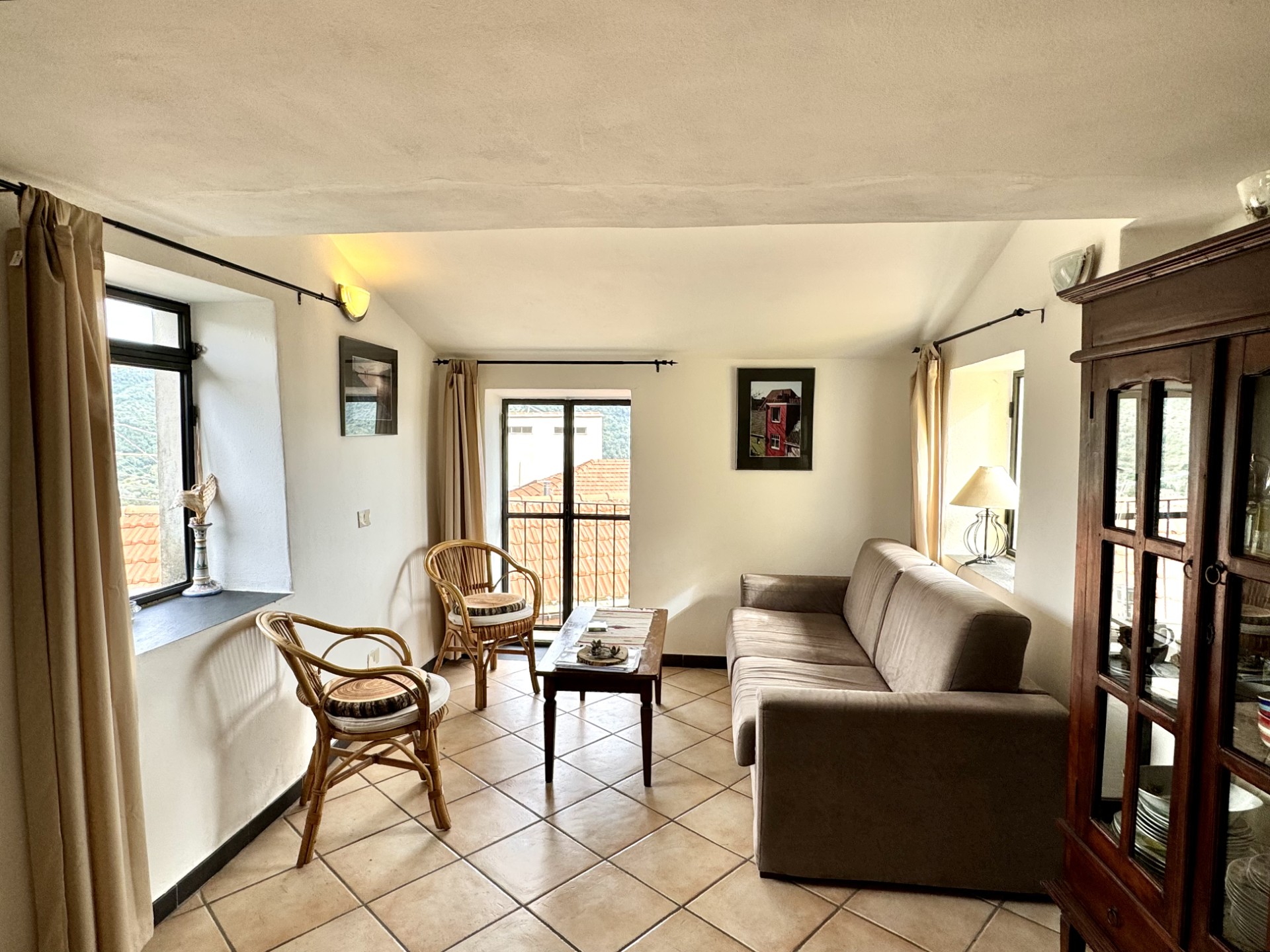 La casa di paese è indipendente su due lati e la porzione superiore in vendita offre ca. 70 m² netti di superficie abitabile su due livelli, oltre a una terrazza sul tetto di ca. 12 m². L’ingresso si trova in un piccolo e tranquillo vicolo e conduce nel disimpegno con stufa a pellet. Al piano terra si trovano anche una camera da letto spaziosa e il bagno. Una bella scala in ardesia conduce al primo piano, dove si trova una zona giorno luminosa con cucina a vista, tavolo da pranzo e area salotto. Da qui si può ammirare il verde paesaggio collinare che si estende fino al Mar Mediterraneo. La terrazza sul tetto offre una splendida vista panoramica sulle Alpi Marittime e lo spazio per un tavolo e delle sedie, nonché dei lettini prendisole.