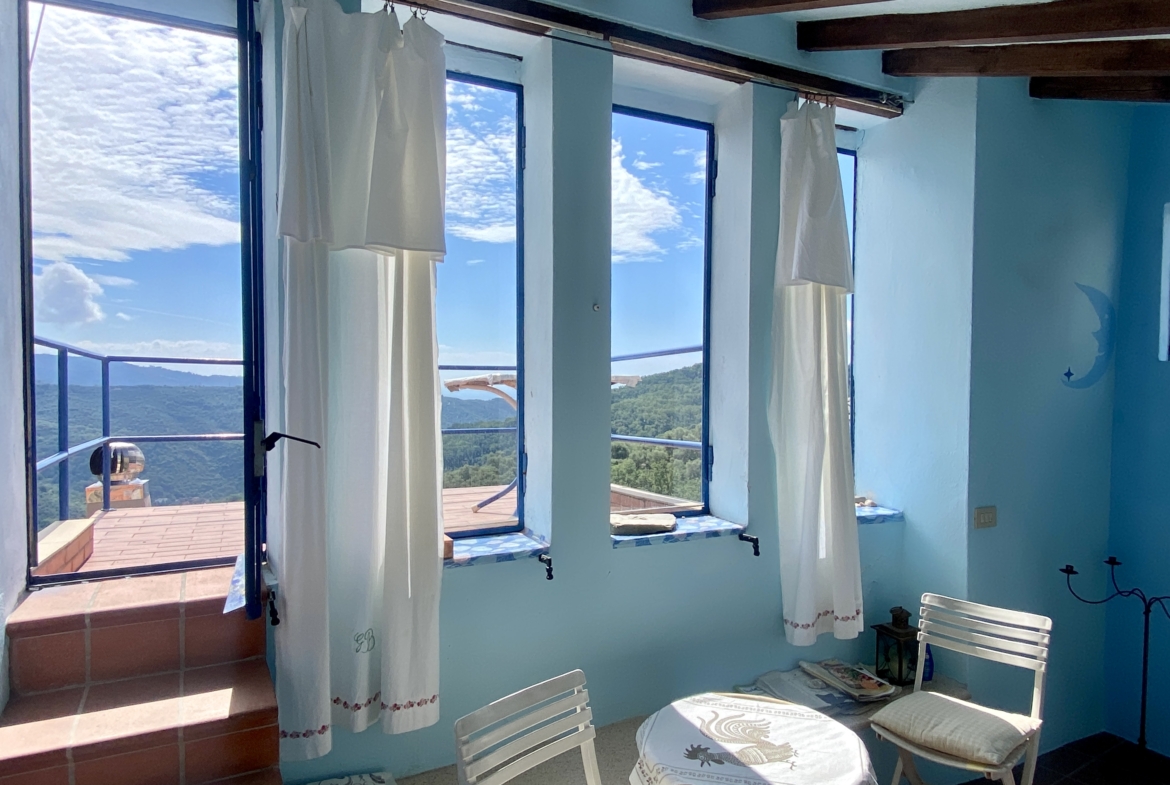 The traditional Ligurian house is situated on the edge of the village offering unobstructed views of the valley and a net living space of approx. 90 sqm on three floors. Through a shared entrance, you reach a cozy living room-kitchen. On the same floor you also find the main bedroom. A spiral staircase takes you upstairs into a bright studio and to the terrace. On the ground floor, also accessible through another spiral staircase, there is the bathroom and a living room with a sofa-bed, a kitchenette and a dining area, ideal for guests because of a separate entrance.