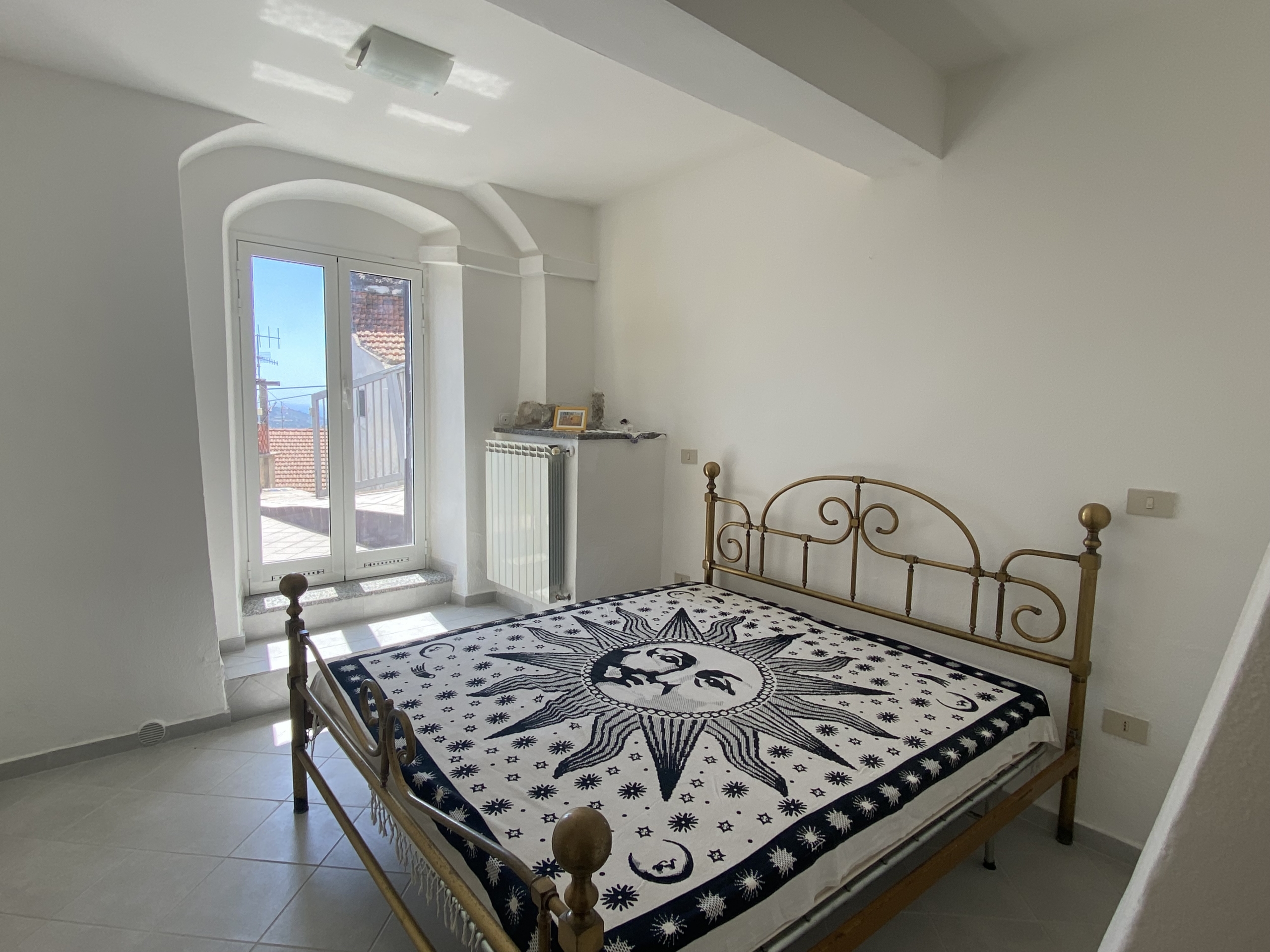 The flat on the ground floor of a three-storey village house disposes of a well-used living area of approx. 40 sqm net and a storage room of approx. 15 sqm usable area. The entrance on the terrace leads directly into the small living-dining room with kitchen corner. Next to it there is a narrow bathroom with a hip bath tub and a window. The two bedrooms, a double and a single room with space for a single or bunk bed, have French doors to the terrace. The sunny tiled terrace of approx. 48 sqm, also features a flower bed and faces southeast, offering views of evergreen olive hills and the picturesque villages of the Prino Valley! The storage room is next to the flat and houses a pellet heating system for the autonomous heating.
