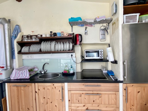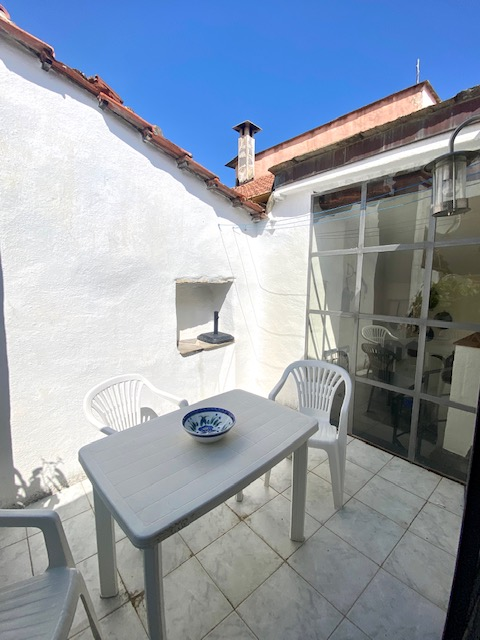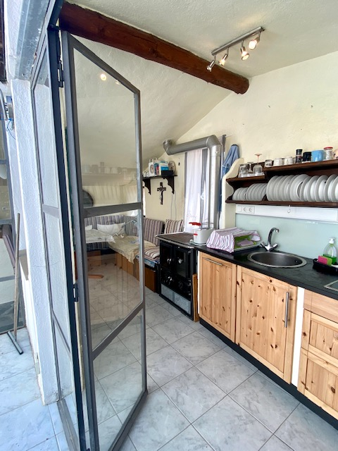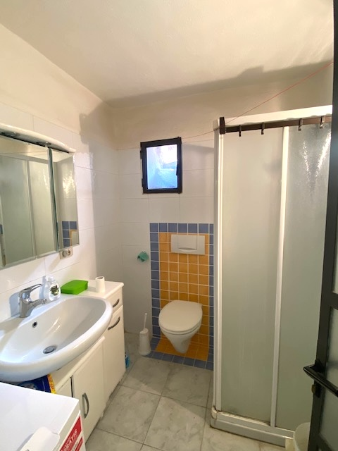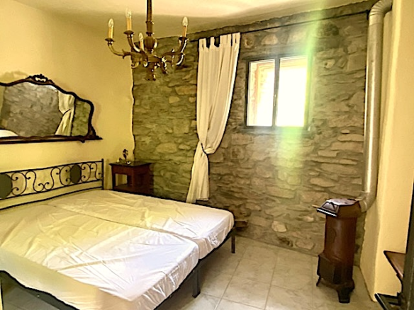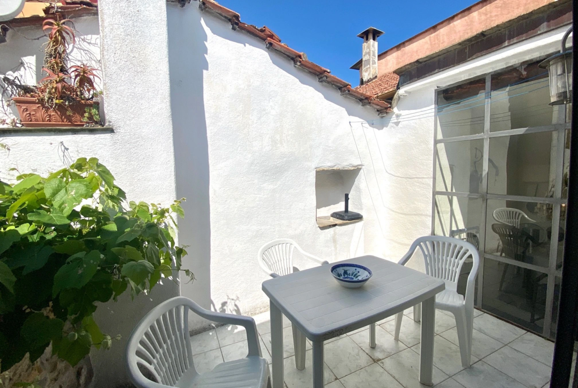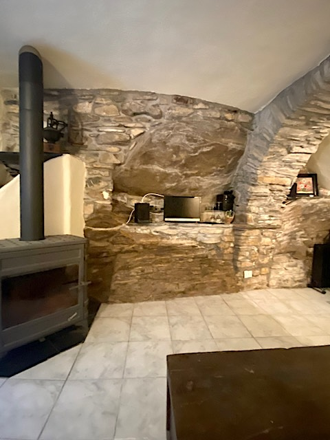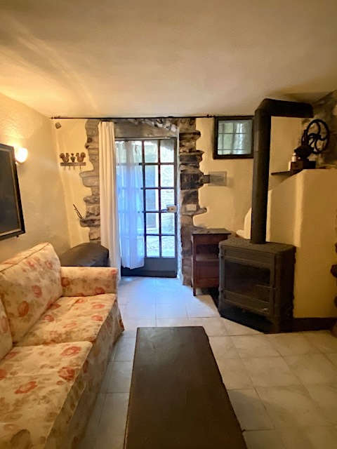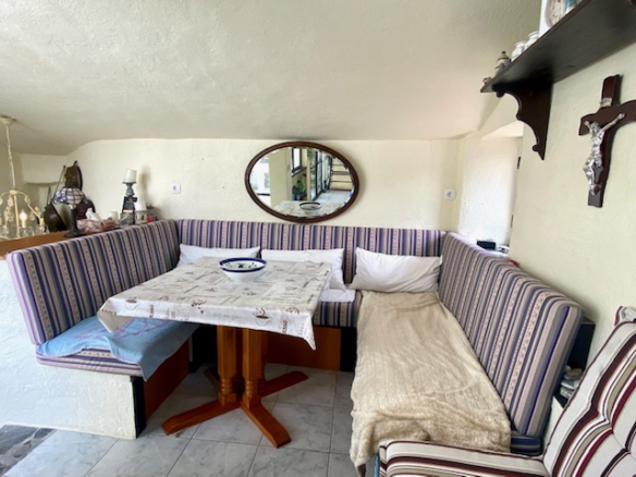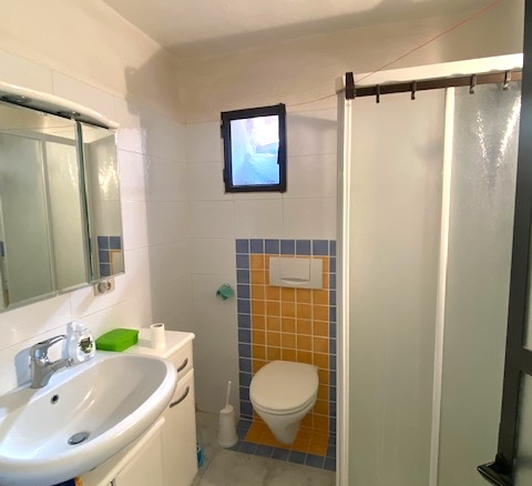 The house has a net living space of approx. 51 square metres spread over three floors. The ground floor comprises the living room with rustic natural stone walls, while the first floor has a bedroom and a bathroom. Upstairs, you will find the bright kitchen with seating and large windows facing the terrace.